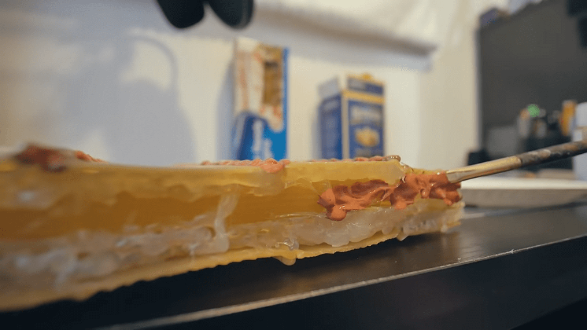 ตัวเคสพาสต้าทั้งหมด ทำขึ้นจากเส้นพาสต้ารูปร่างต่าง ๆ เอามาทาสีแดงคล้ายกับใส่ซอร์สมะเขือเทศ จากนั้นประกอบมันเข้าไปโดยใช้กาวร้อนค่อย ๆ ต่อทีละส่วน จนสำเร็จ รูปร่างที่ออกมาอาจจะคล้ายกับ