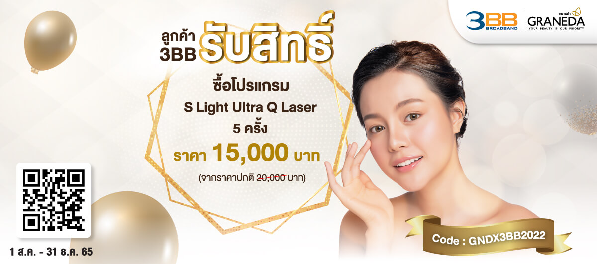 คลินิกความงามด้านผิวพรรณ ให้คุณสวยอย่างเป็นธรรมชาติ ลูกค้า 3BB รับสิทธิ์ซื้อโปรแกรม S Light Ultra Q Laser 5 ครั้ง ราคาพิเศษเพียง 15,000 บาท (ปกติ 20,000 บาท) เพียงโชว์สื่อโปรโมทหรือแจ้ง        CODE : GNDX3BB2022 เพื่อรับสิทธิ์ที่ Granada Clinic ทุกสาขา ถึง 31 ธันวาคม 2565