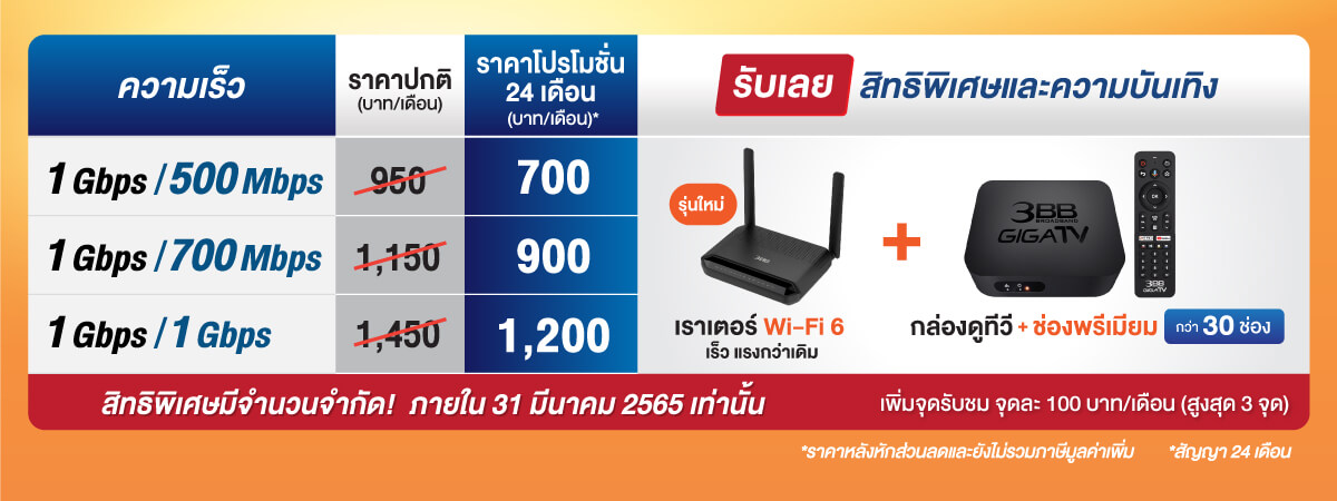 3BB GIGATV จัดแพ็กเกจใหม่รับปีเสือ ความเร็วขั้นต่ำ 1 Gbps/500 Mbps คุ้มสูงสุด เพียงเดือนละ 700 บาท