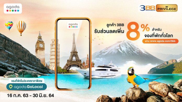 วางแผนเที่ยวแบบชิลชิล พร้อมเลือกที่พักและรับส่วนลดราคาพิเศษกับโรงแรม รีสอร์ทและโฮสเทลกว่า 2 ล้านแห่งทั่วโลก ลูกค้า 3BB รับส่วนลดเพิ่มอีก 8% เมื่อจองที่พักผ่าน www.agoda.com/3bb กดรับรหัสส่วนลดได้ที่ 3BB Member Application ตั้งแต่วันนี้ถึง 30 มิถุนายน 2564 และสามารถเข้าพักได้จนถึง 31 ธันวาคม 2564 จำกัดจำนวน 100,000 สิทธิ์ตลอดแคมเปญ