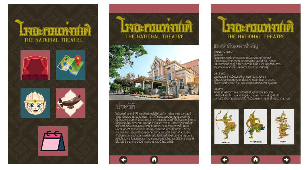 ภายในแอปพลิเคชันมีเป้าหมายในการนำเสนอข้อมูลของโรงละครแห่งชาติเป็นหลัก ภายในตัวแอปพลิชันก็จะมี 4 ฟังก์ชันให้เลือกใช้งาน ฟังก์ชันแรกคือ ข้อมูลประวัติของโรงละครแห่งชาติที่มีการอัพเดทใหม่อยู่ตลอด เพื่อให้ผู้ที่ใช้ได้ได้รับข้อมูลข่าวสารที่ถูกต้องและครบถ้วน ฟังก์ชันที่สองคือ เรื่องการแสดงที่โรงละครแห่งชาติเลยใช้ ฟังก์ชันสามคือลักษณะเสื้อผ้า เครื่องแต่งกาย ประเภทต่างๆ และอย่างสุดท้ายคือปฏิทินแสดง เราจะบอกไว้เลยว่าในแต่ละเดือนวันไหนบ้างที่โรงละครมีการจัดแสดง หรือวันไหนบ้างที่มีกิจกรรมให้ผู้ชมสามารถเข้าร่วมได้