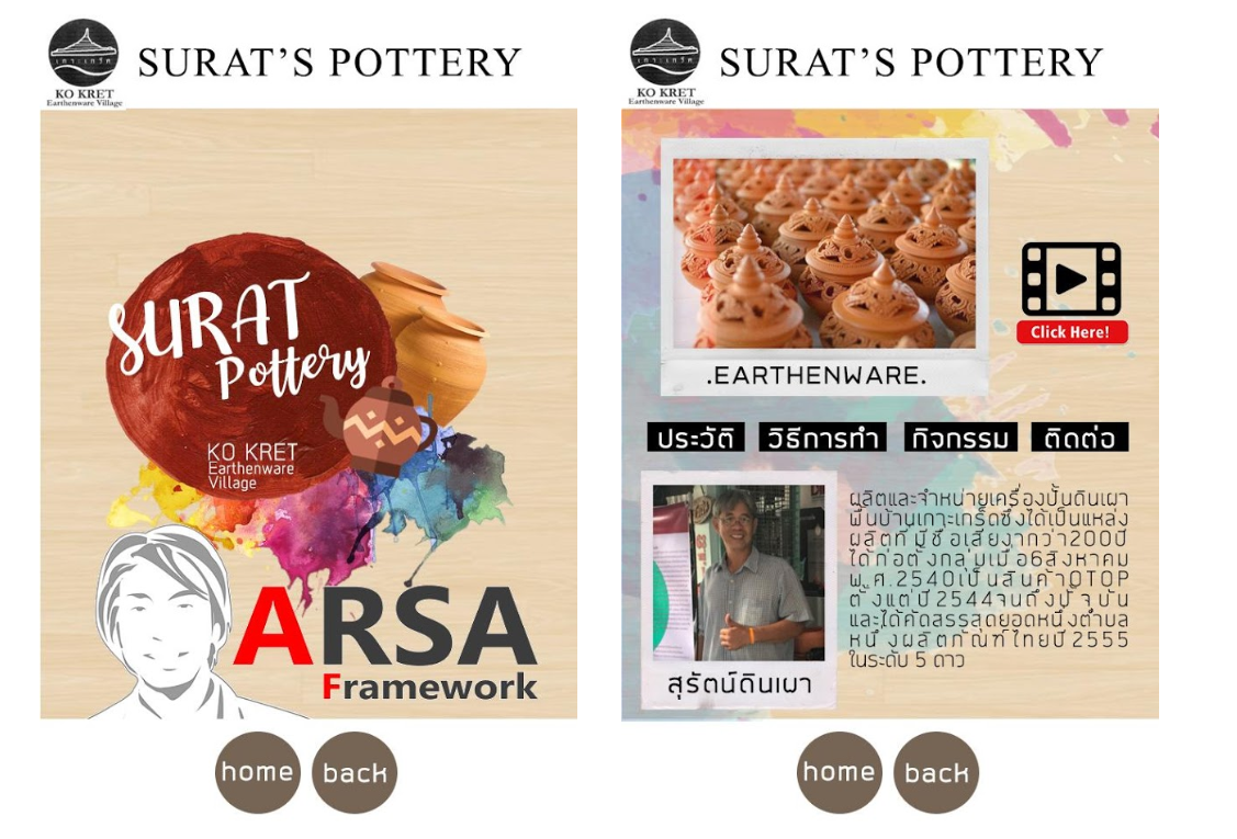 ภายในแอปพลิเคชั่น Surat Pottery จะบอกเล่าเรื่องราวทั้งหมดที่เกี่ยวข้องกับร้านเครื่องปั้นดินเผาคุณลุงสุรัตน์ ตั้งแต่ทำเลที่ตั้ง วิธีการทำเครื่องปั้นดินเผา กิจกรรม ตลอดจนช่องทางการติดต่อ โดยทำมาในรูปแบบที่อ่านง่าย สวยงาม และใช้งานง่ายไม่ซับซ้อน ซึ่งทางกลุ่มได้ส่งมอบแอปพลิเคชั่นให้แก่คุณลุงสุรัตน์ บัวหิรัญ อย่างเป็นทางการเมื่อวันที่ 8 เมษายน 2562 พร้อมกับพูดคุยถึงสิ่งที่ได้จากการสร้างสรรค์แอปพลิเคชั่นในครั้งนี้ด้วย