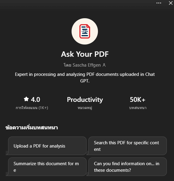 ปลั๊กอินสำหรับอัปโหลดไฟล์ PDF ได้อย่างง่ายดาย แค่วางคำถามใน ChatGPT และปล่อยให้ปลั๊กอินช่วยจัดการส่วนที่เหลือ ทั้งช่วยเรื่องการประมวลผล และวิเคราะห์เอกสารที่อัปโหลดว่าสามารถสั่งงาน หรือทำอะไรได้บ้าง ไม่ว่าจะช่วยสรุปหรือหากต้องการฟังก์ชั่นอื่นๆ ที่เกี่ยวกับเอกสาร PDF ให้ Plugin นี้ช่วยคุณได้เลย