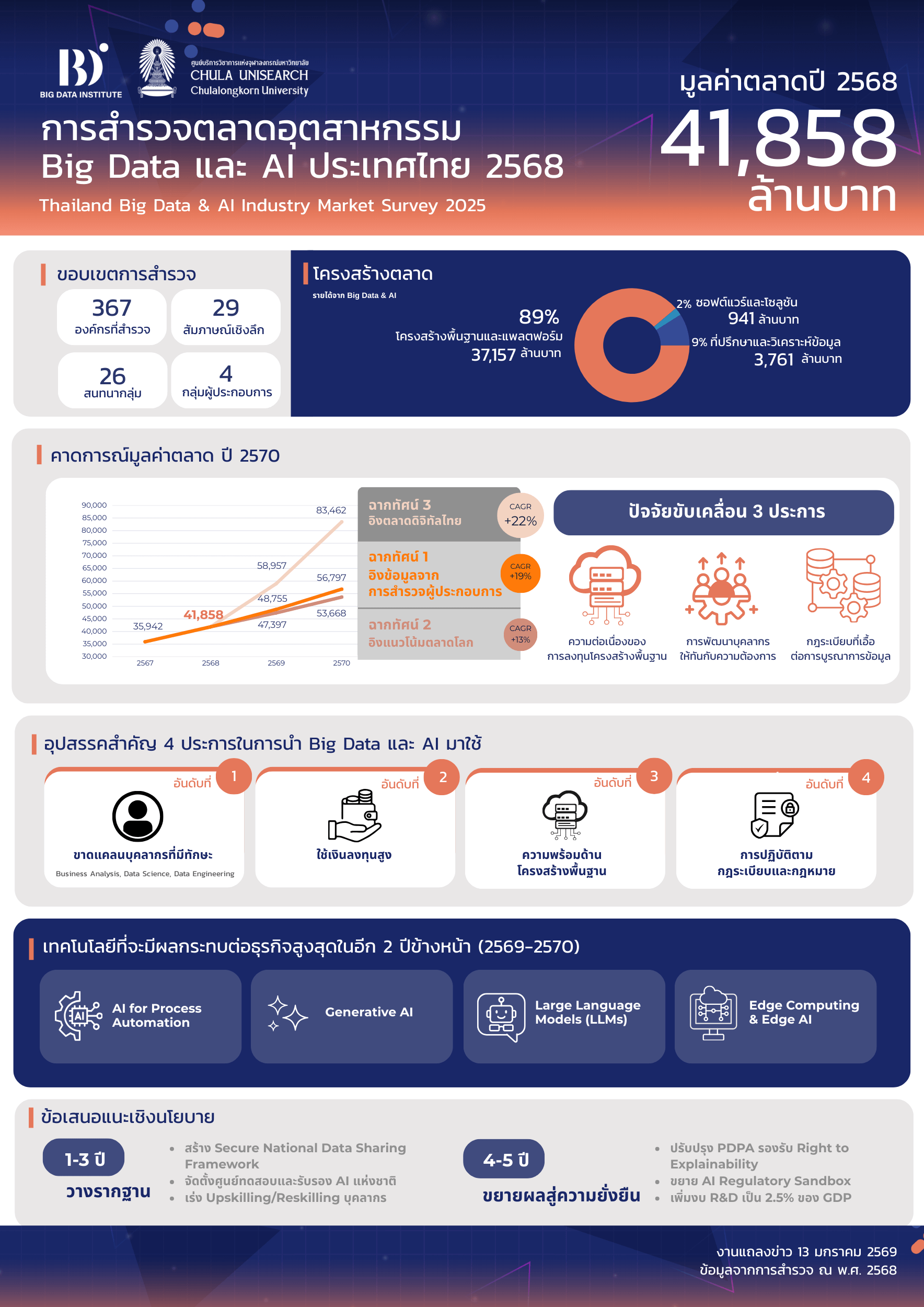 ศ. ดร.ธีรณี อจลากุล ผู้อำนวยการสถาบันข้อมูลขนาดใหญ่ กล่าวว่า การสำรวจครั้งนี้ดำเนินการโดยศูนย์บริการวิชาการแห่งจุฬาลงกรณ์มหาวิทยาลัย ครอบคลุมกลุ่มเป้าหมายทั้งภาครัฐและเอกชนมากกว่า 400 แห่ง เพื่อให้ได้ข้อมูลที่ครอบคลุมและน่าเชื่อถือ ซึ่งการประเมินครั้งนี้ใช้วิธี Ratio-based Market Sizingพบว่า มูลค่าตลาดอุตสาหกรรม Big Data และ AI ของประเทศไทยในปี 2568 มีมูลค่าประมาณ 41,858 ล้านบาท จากข้อมูลปฐมภูมิกว่า 367 องค์กร ในอุตสาหกรรมวิเคราะห์ผู้ประกอบการใน Value Chain 3 กลุ่ม ได้แก่ ผู้ให้บริการโครงสร้างพื้นฐานและแพลตฟอร์มผู้พัฒนาซอฟต์แวร์และโซลูชัน และผู้ให้บริการที่ปรึกษาและวิเคราะห์ข้อมูล สะท้อนมูลค่าตลาดจากฝั่งผู้ให้บริการ (Supply Side) อย่างครอบคลุม และสำรวจความต้องการในฝั่งผู้รับบริการ (Demand Side) รวมถึงการยืนยัน ผลการสำรวจผ่านผู้เชี่ยวชาญในอุตสาหกรรม