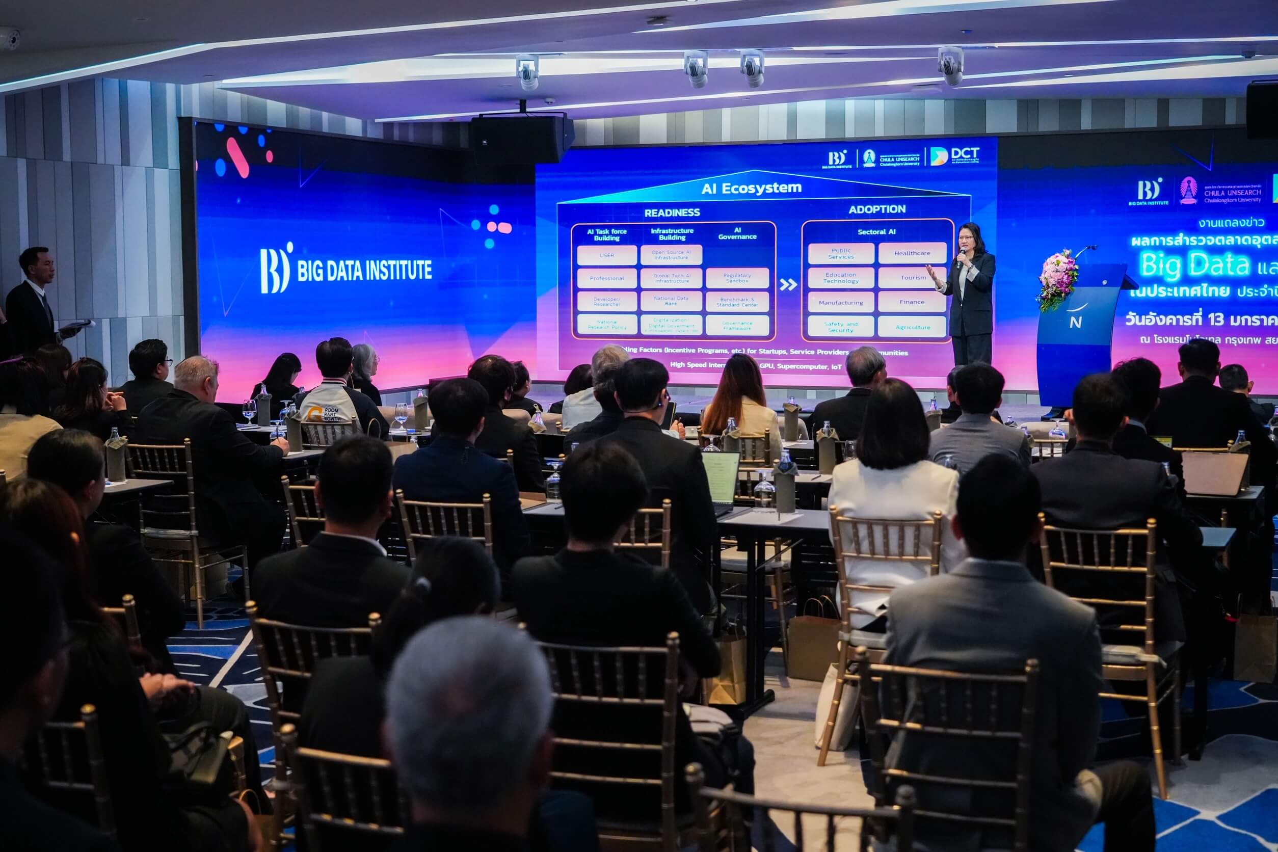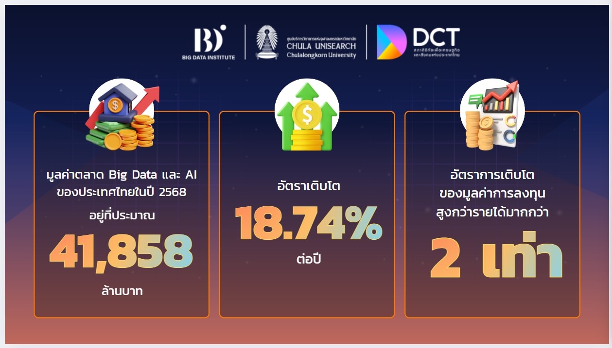 สถาบันข้อมูลขนาดใหญ่ (องค์การมหาชน) หรือ BDI ร่วมกับศูนย์บริการวิชาการแห่งจุฬาลงกรณ์มหาวิทยาลัย เปิดเผยผลการสำรวจตลาดอุตสาหกรรม Big Data และ AI ของประเทศไทย ประจำปี 2568 พบ มูลค่าตลาดพุ่งแตะ 41,858 ล้านบาท เติบโตต่อเนื่องจากปีก่อนหน้า 18% ขณะที่ ปัญหาขาดแคลนบุคลากรยังเป็น “วิกฤตเงียบ” ที่ต้องเร่งแก้ไข ด้าน BDI ประกาศเดินหน้าแพลตฟอร์ม D2 เปิดให้บริการเต็มรูปแบบปี 2569 พร้อมเปิดตัว ThaiLLM โมเดลใหญ่สุดภายในเดือนนี้