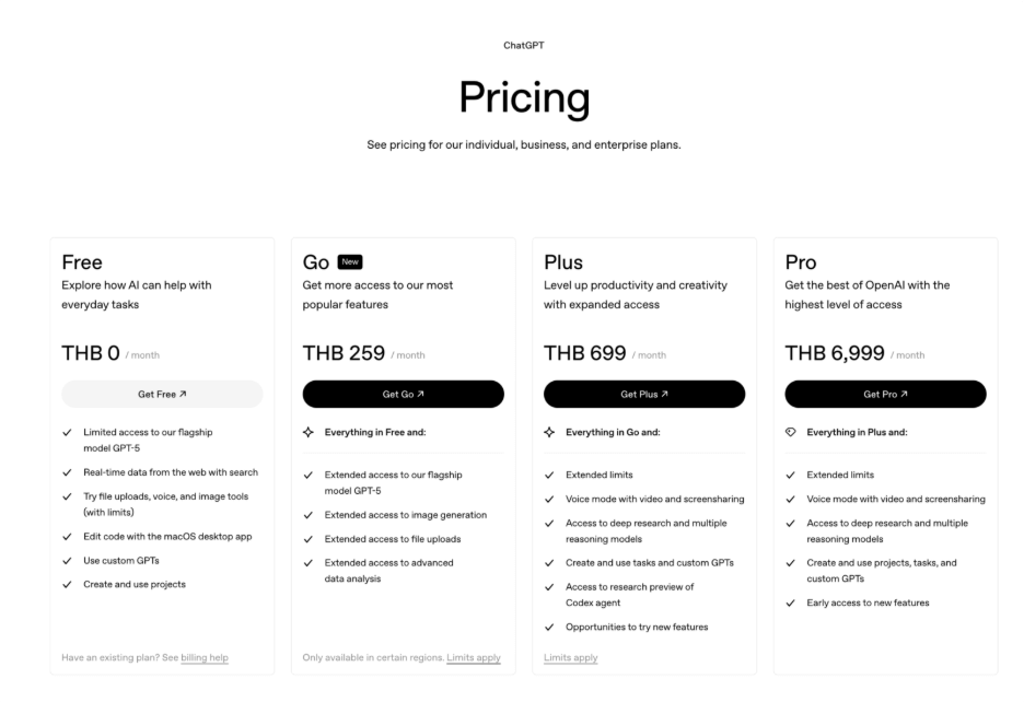 ChatGPT Go เป็นหนึ่งในตัวเลือกแผนสมาชิก (Subscription) พร้อมตัวเลือกอื่น ๆ ดังนี้: