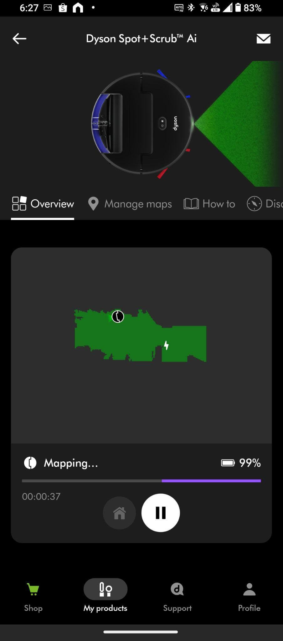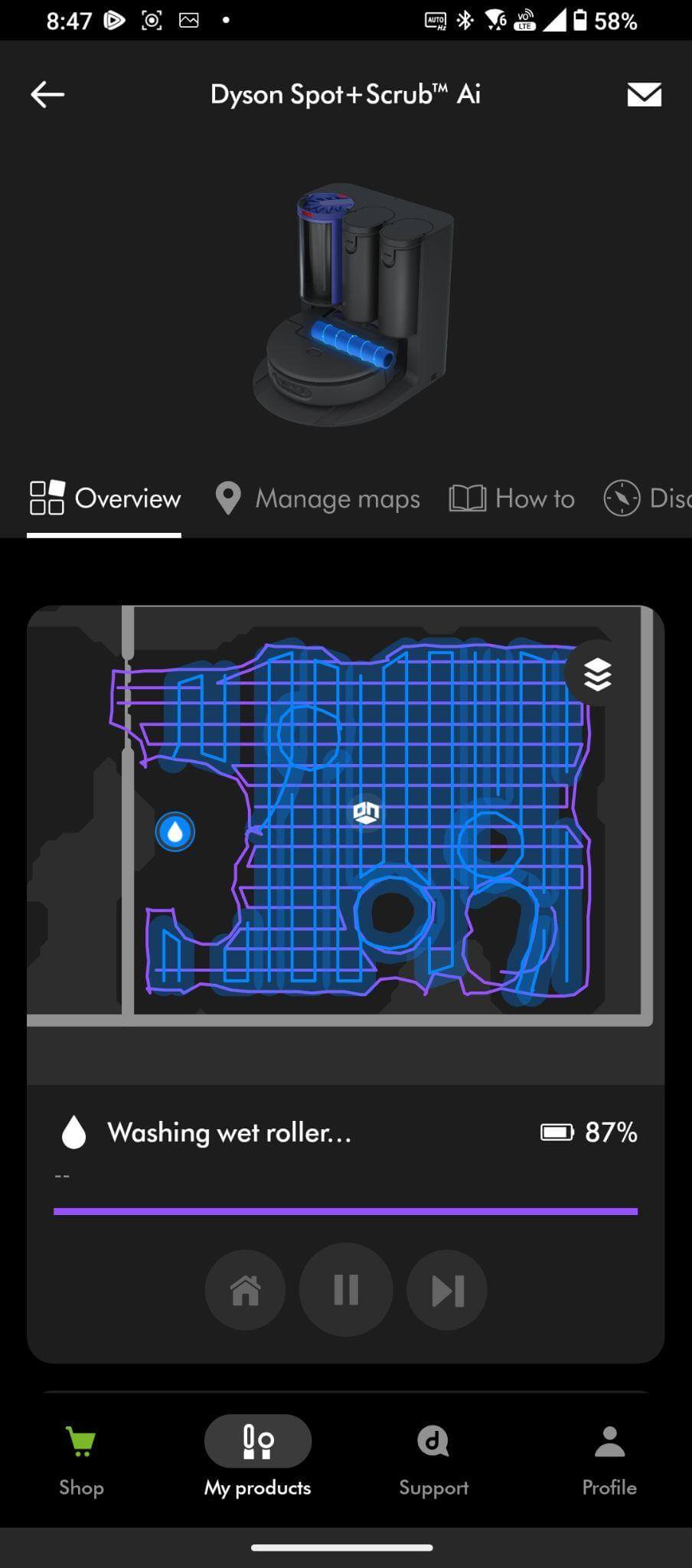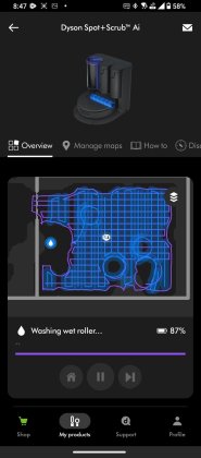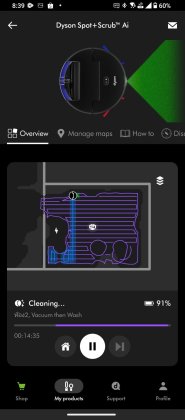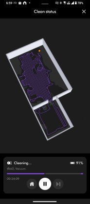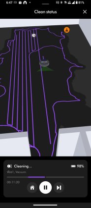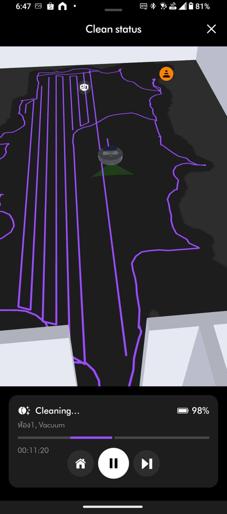 - Mapping และแสดงผลแบบ Real-time: ระบบสามารถสแกนและสร้างแผนที่บ้าน แยกโซนห้องต่างๆ ได้อย่างแม่นยำ ผู้ใช้สามารถติดตามการทำงานแบบ Real-time โดยเลือกดูได้ทั้งมุมมองแบบ 2D และ 3D แอปจะแสดง “เส้นสีม่วง” สำหรับพื้นที่ที่ดูดฝุ่น และ “เส้นสีฟ้า” สำหรับบริเวณที่ใช้น้ำถูพื้น