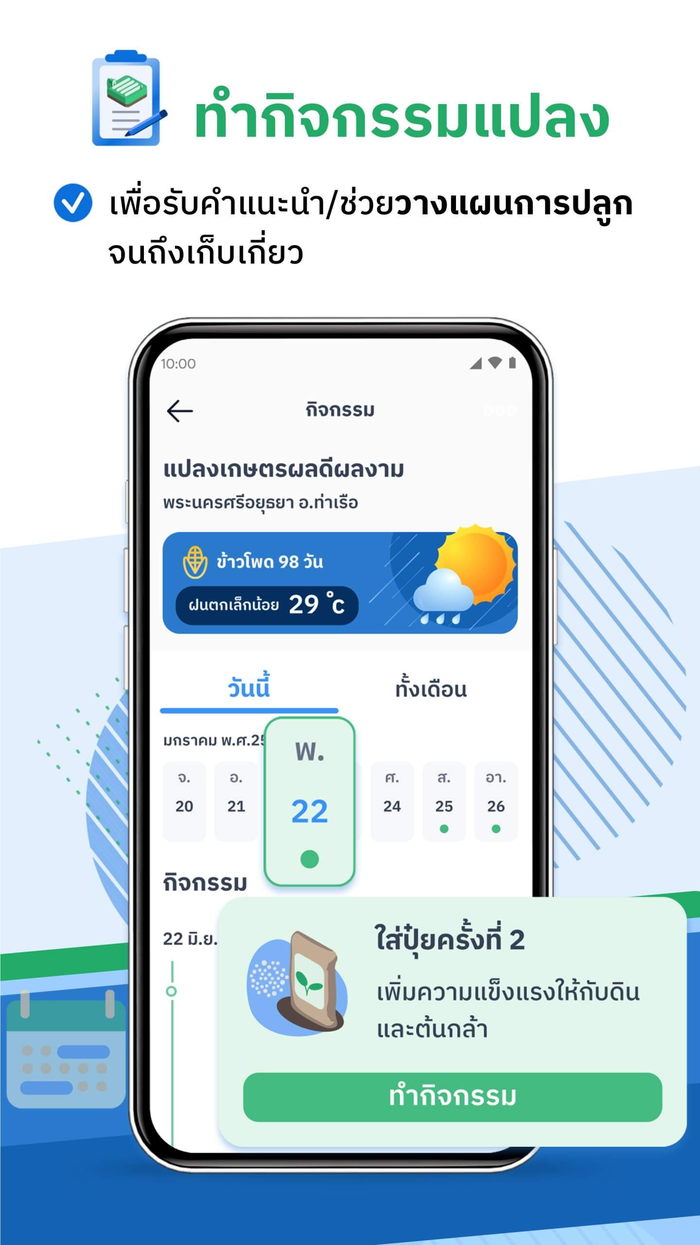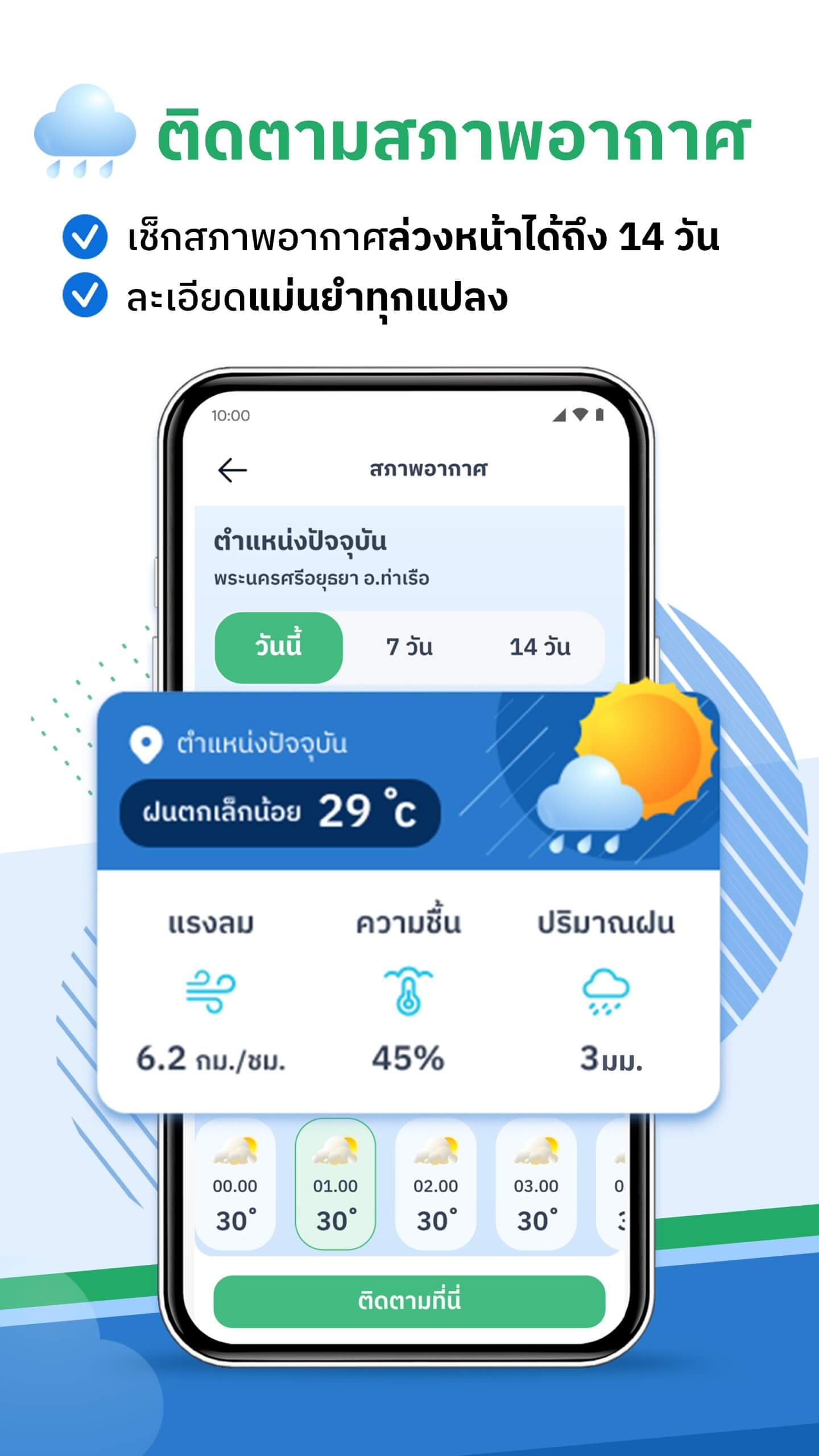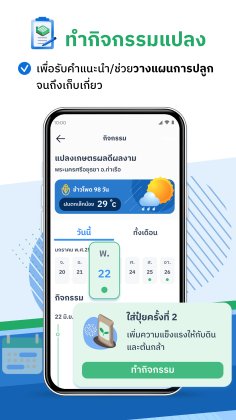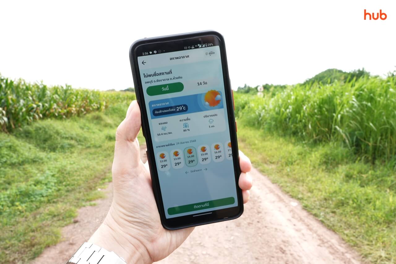 - พยากรณ์อากาศระดับแปลง : ไม่ใช่แค่บอกสภาพอากาศระดับอำเภอ แต่แม่นยำถึงระดับแปลงปลูกของเกษตรกร และดูข้อมูลล่วงหน้าได้ถึง 14 วัน ช่วยให้วางแผนการให้น้ำให้ปุ๋ยได้อย่างมีประสิทธิภาพ