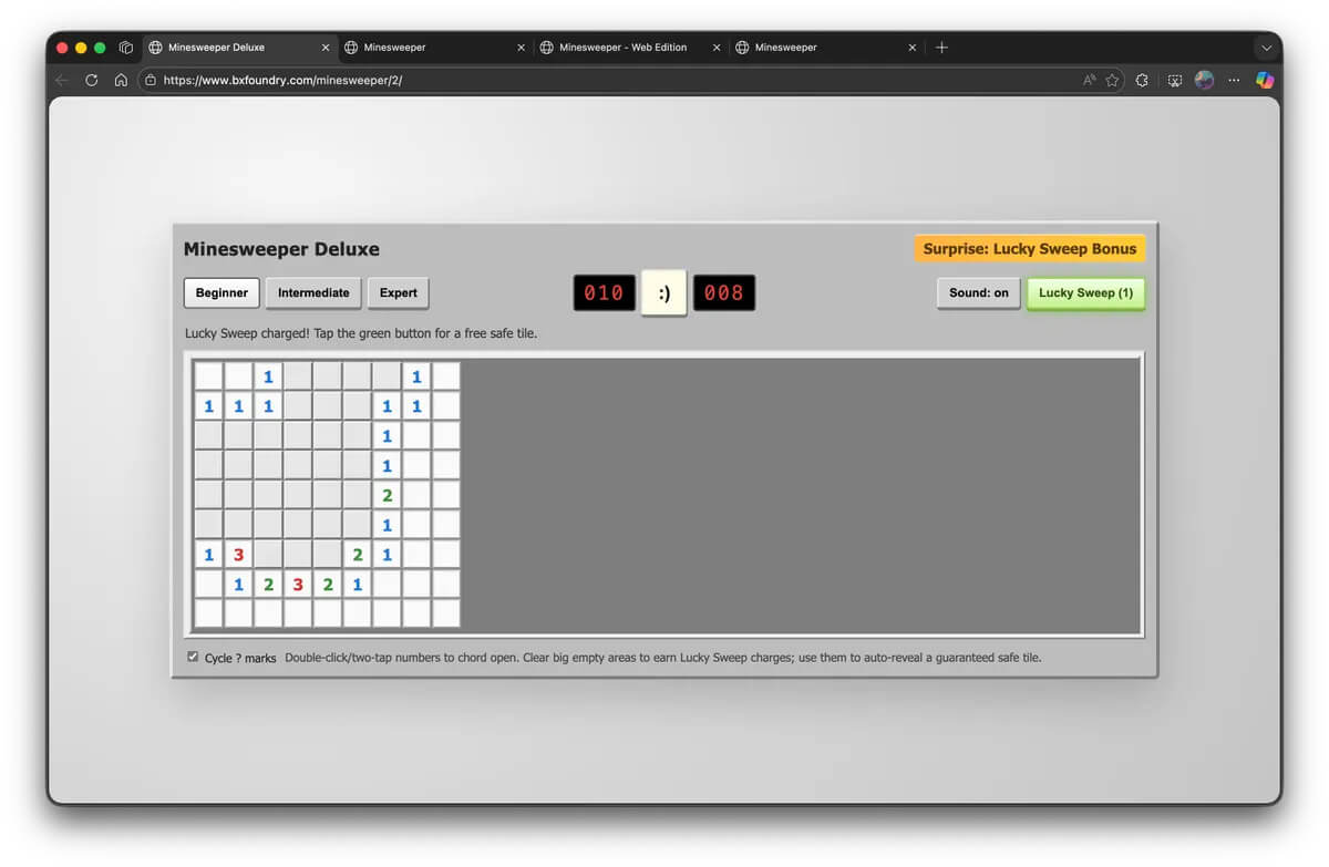 นับเป็น AI ตัวเดียวที่ใส่ระบบ “Chording” (คลิกเปิดช่องรอบ ๆ อัตโนมัติเมื่อปักธงครบ) ซึ่งเป็นฟีเจอร์หัวใจสำคัญที่คนเล่น Minesweeper ขาดไม่ได้ นอกจากนี้ยังมีปุ่มเปิด-ปิดเสียง และใส่ลูกเล่น “Lucky Sweep” ที่ช่วยเปิดช่องปลอดภัยให้ผู้เล่นเมื่อกดใช้ด้วย