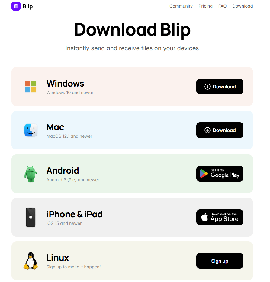 1.เข้าไปดาวน์โหลดโปรแกรม Blip ที่นี่ ลงในอุปกรณ์ที่ต้องการแชร์ไฟล์ สามารถเลือกรูปแบบ Device ที่ต้องการได้ มีทุกแพลตฟอร์ม ทั้ง Windows, MAC, Android, iPhone iPad และ Linux