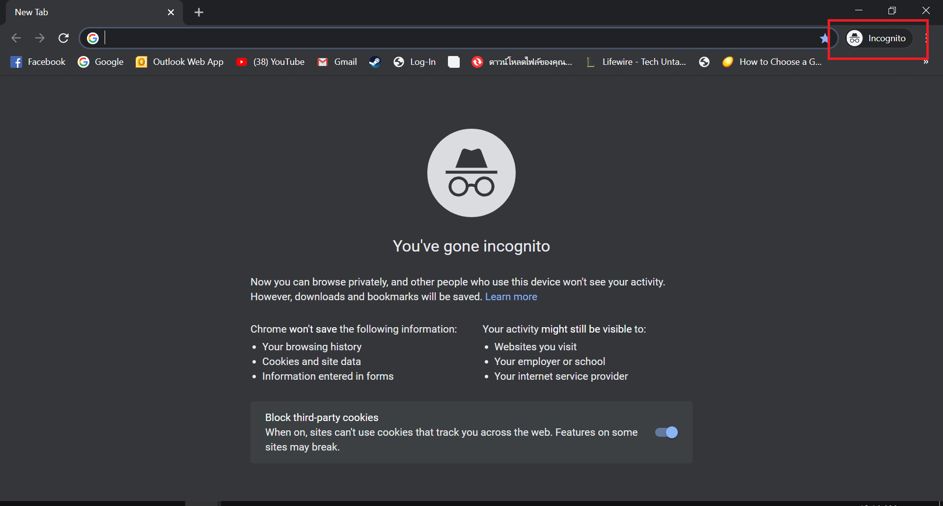1.1 เมื่อเราหน้าจอของโหมดส่วนตัวแล้ว Chrome จะขึ้นแจ้งเตือนด้านขวาบนเสมอว่า Incognito