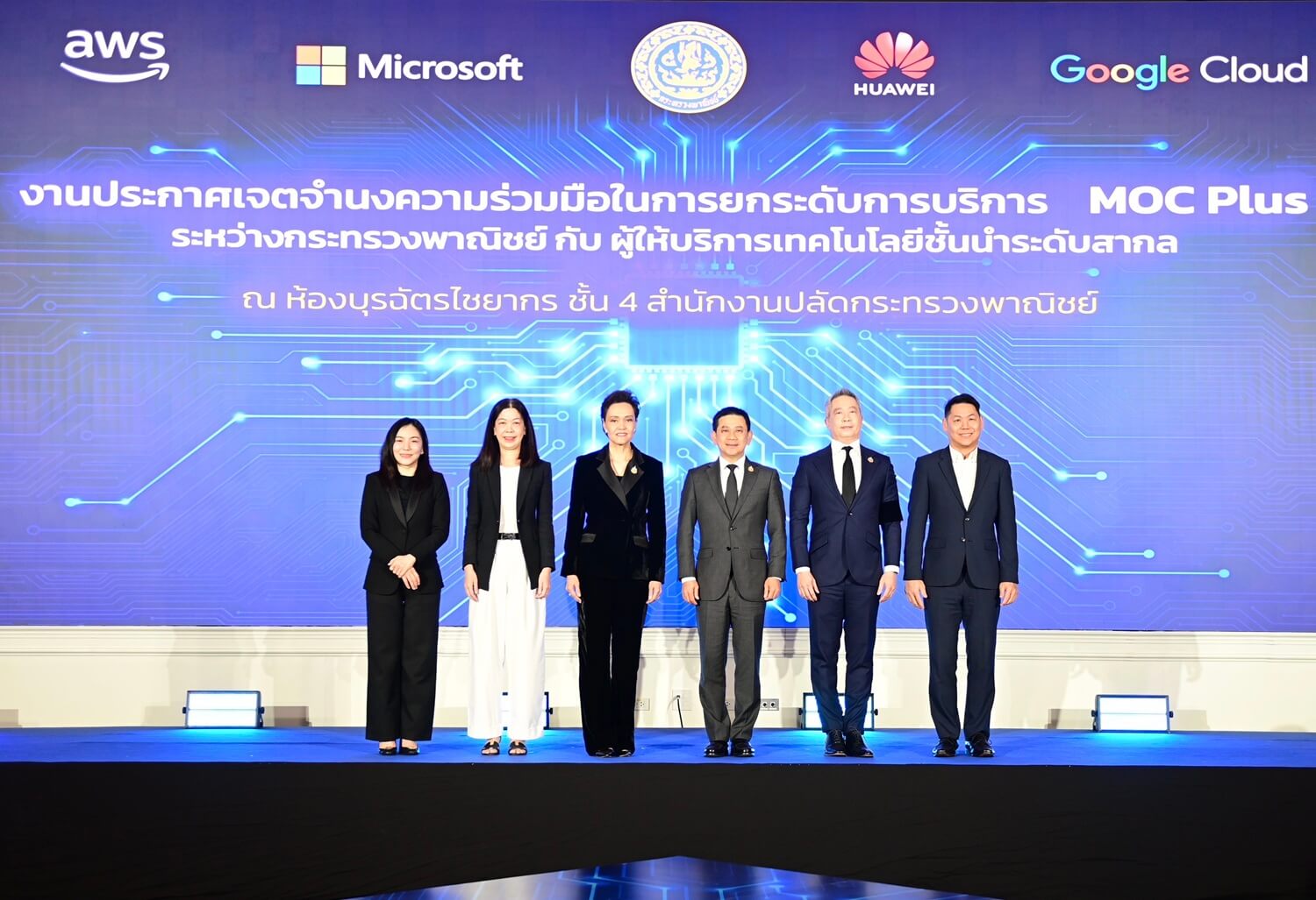 “ประกาศเจตจำนงความร่วมมือ” ระหว่างกระทรวงพาณิชย์และพันธมิตรเทคโนโลยีระดับโลก ได้แก่ Huawei, Google, Amazon Web Services และ Microsoft ยืนยันบทบาทสำคัญในการสนับสนุนโครงสร้างพื้นฐานด้าน AI และ Cloud เพื่อพัฒนา MOC Plus ให้ก้าวสู่การเป็นแพลตฟอร์มรัฐบาลดิจิทัลที่สมบูรณ์