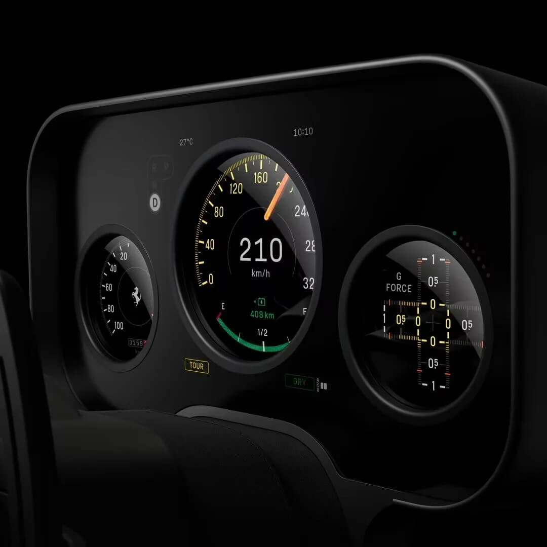 ส่วนพวงมาลัยก็มาในสไตล์ Retro ซึ่งดีไซน์ 3 ก้านแบบก้านเล็กที่ทำจากอะลูมิเนียมรีไซเคิล 100% ได้แรงบันดาลใจจากพวงมาลัยไม้ Nardi ยุค 1950 แต่ปรับให้ดูโมเดิร์นและเบากว่าพวงมาลัยปกติของ Ferrari ถึง 400 กรัม