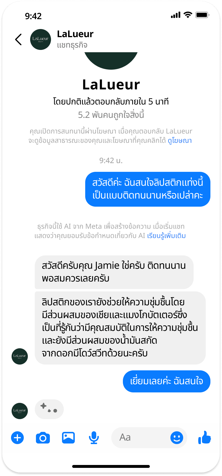 คุณแพร ดำรงค์มงคลกุล Country Director ประจำ Facebook ประเทศไทย จาก Meta กล่าวว่า “วิสัยทัศน์ของเราคือการขับเคลื่อนให้ธุรกิจไทยยกระดับความสำเร็จด้วยพลังของเอไอ เช่นเดียวกับที่ธุรกิจไทยแทบทุกแห่งมีหน้าร้านดิจิทัลบน Facebook Page และโปรไฟล์บน Instagram เราเชื่อมั่นอย่างยิ่งว่าทุกธุรกิจไทยและผู้ประกอบการควรมีผู้ช่วย AI ของตัวเอง การส่งข้อความยังคงเป็นช่องทางที่คนไทยนิยมใช้มากที่สุดในการสื่อสารกับแบรนด์ที่พวกเขาชื่นชอบ และการเปิดตัว Business AI บน Messenger ในครั้งนี้ คือการนำเทคโนโลยีล้ำสมัยมาสู่ผู้ประกอบการไทยทุกคน เครื่องมือนี้ไม่เพียงแต่ช่วยให้ธุรกิจไทยสามารถโต้ตอบกับลูกค้าได้ตลอด 24 ชั่วโมง  แต่ยังทำให้เส้นทางการตัดสินใจของลูกค้า (customer journey) มีความง่ายและสะดวกขึ้น ตอบโจทย์พฤติกรรมที่ลูกค้าต้องการ อีกทั้งยังทำหน้าที่เป็น “กำลังเสริม” ที่ทรงพลังให้กับทีมธุรกิจของคุณ โดย Business AI สามารถสะท้อนความรู้เฉพาะของธุรกิจและน้ำเสียงของแบรนด์ได้อย่างลงตัว ช่วยให้ธุรกิจดำเนินงานและเติบโตได้อย่างมีประสิทธิภาพอย่างรวดเร็ว พร้อมปลดล็อกศักยภาพได้อย่างเต็มที่”