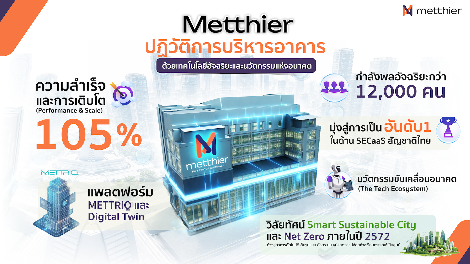สำหรับบริษัท เมทเธียร์ จำกัด (Metthier) เป็นผู้ให้บริการบริหารจัดการอสังหาริมทรัพย์อัจฉริยะแบบครบวงจร (Smart Facility Management) ที่รังสรรค์เทคโนโลยีขั้นสูง Smart Facility Management ไม่ว่าจะเป็น AI CCTV, Smart Incident Management, Digital Twin, 3D Visualization, Indoor Mapping, AIoT and Robotics เข้ามาช่วยเพิ่มประสิทธิภาพการทำงานของบุคลากรและระบบภายในอาคาร โดยควบคุมการทำงานผ่านศูนย์ปฏิบัติการอัจฉริยะเมทเธียร์ (Metthier Intelligent Operation Center: MIOC) พร้อมแพลตฟอร์ม “METTRIQ” (Metthier Reformative IQ) แพลตฟอร์มการบริหารจัดการอาคารอัจฉริยะครบวงจรแพลตฟอร์มแรกในประเทศไทยที่รวม 12 ระบบเทคโนโลยีไว้ในแพลตฟอร์มเดียว ช่วยให้ผู้ประกอบการรายย่อยจนถึงรายใหญ่ที่ให้ความสำคัญกับเรื่อง ESG ให้เข้าถึงแพลตฟอร์มเปิดที่ทันสมัยในการบริหารจัดการอาคารได้อย่างมีประสิทธิภาพสูงสุดและยั่งยืน ปัจจุบันบริษัทให้บริการดูแลอสังหาริมทรัพย์ครอบคลุม 8 ประเภท ได้แก่ ที่พักอาศัย, โรงพยาบาล, โรงเรียน, ห้างสรรพสินค้า, อาคารสำนักงาน, หน่วยงานภาครัฐ, พื้นที่อุตสาหกรรมกรรมขนาดใหญ่ และการคมนาคมขนส่งสาธารณะ ด้วยเทคโนโลยีแห่งอนาคตรายแรกของไทย ในเครือบริษัท สกาย ไอซีที จำกัด (มหาชน) หรือ สกาย กรุ๊ป