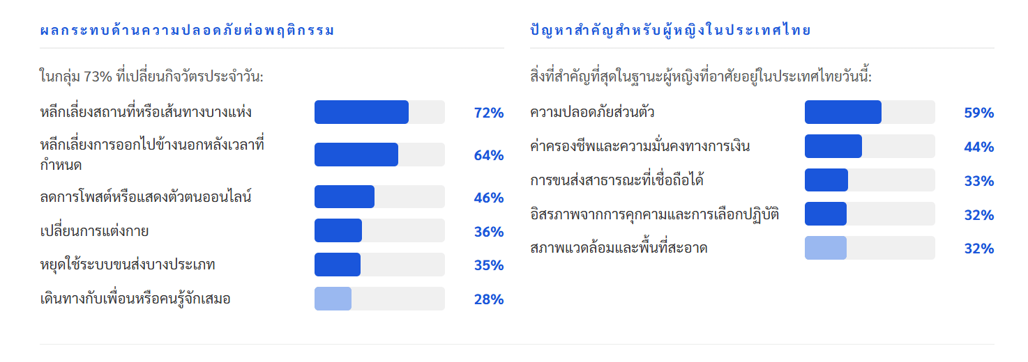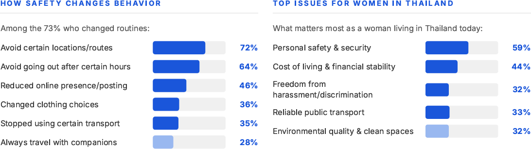 ขณะที่กรุงจาการ์ตาและฮานอย ผู้หญิง 76% ระบุว่าได้ปรับเปลี่ยนที่พฤติกรรมของตนเอง โดย 66% ของผู้หญิงในจาการ์ตาหลีกเลี่ยงการออกนอกบ้านหลังช่วงเวลาที่กำหนด ตามมาด้วยกรุงเทพฯ ที่มีสัดส่วนการปรับเปลี่ยนกิจวัตรอยู่ที่ 73% และ 72% ระบุว่าหลีกเลี่ยงการไปในบางสถานที่ ซึ่งถือเป็นอัตราการหลีกเลี่ยงสถานที่ที่สูงที่สุดที่บันทึกได้ แม้แต่ในสิงคโปร์ซึ่งได้รับการจัดอันดับให้เป็นเมืองที่ผู้หญิงรู้สึกปลอดภัยมากที่สุดก็ยังมีผู้หญิงถึง 40% (ต่ำที่สุดในภูมิภาค) ที่ระบุว่ามีการปรับเปลี่ยนพฤติกรรมของตนเอง ซึ่งสะท้อนภาวะย้อนแย้งให้เห็นอย่างชัดเจนว่า ความรู้สึกปลอดภัยนั้นสามารถดำรงอยู่ควบคู่ไปกับการจำกัดเสรีภาพของตนเองได้ด้วย