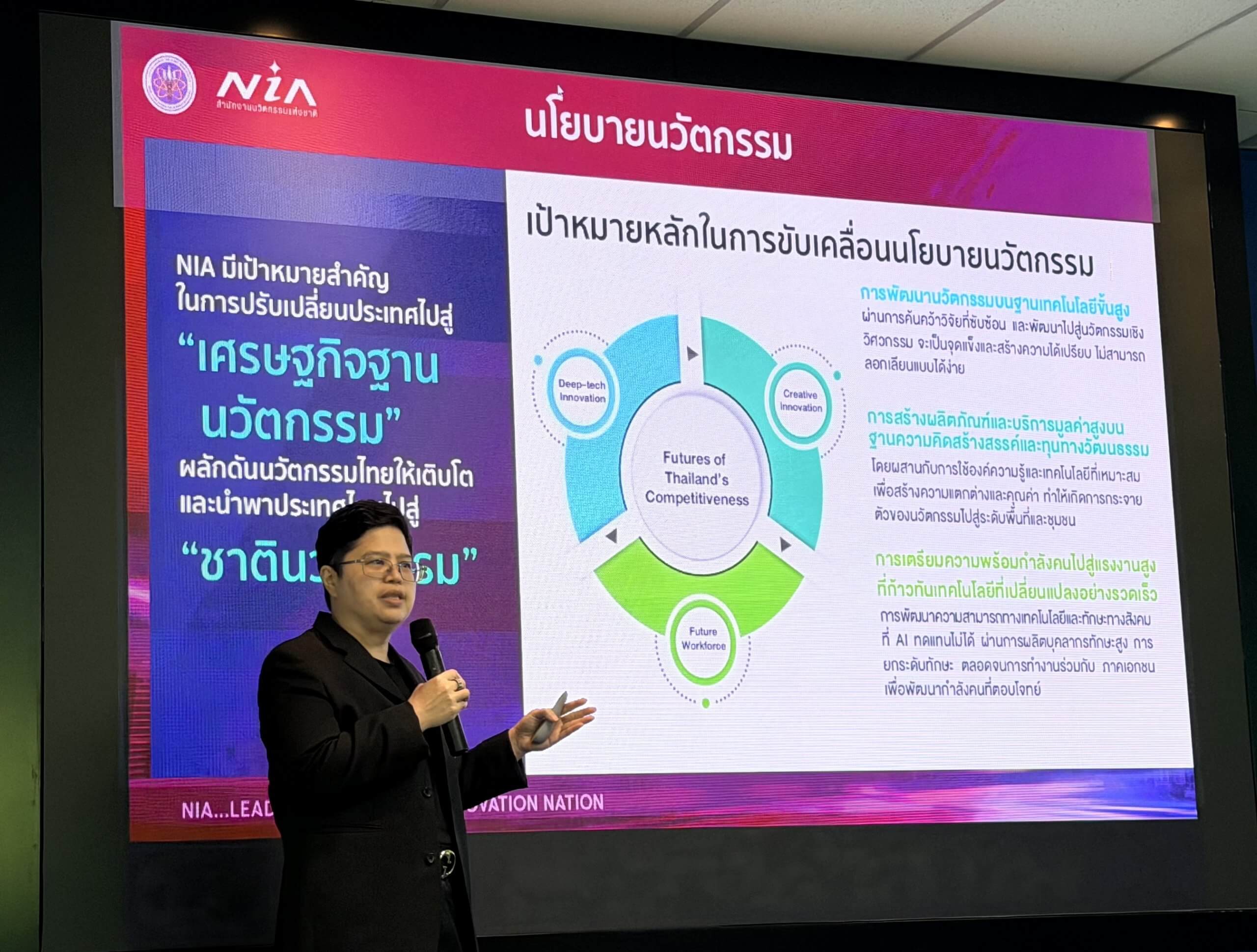 “NIA ทำงานร่วมกับพันธมิตรทั้งในประเทศและต่างประเทศ ในฐานะผู้กำหนดทิศทางนวัตกรรม (Focal Conductor) เพื่อส่งเสริมและสนับสนุนผู้ประกอบธุรกิจนวัตกรรมในทุกมิติผ่านแนวคิด 4G ได้แก่ Groom การบ่มเพาะและพัฒนาศักยภาพด้านนวัตกรรม Grant การให้เงินทุน Growth การสร้างโอกาสขยายตลาดและแหล่งเงินทุน และ Global การเข้าสู่ตลาดระดับโลก และเพื่อสนับสนุนให้ธุรกิจนวัตกรรมไทยสามารถเติบโตอย่างเข้มแข็งและแข่งขันได้ในตลาดโลก โดยในปี 2569 NIA มุ่งเน้นขับเคลื่อนเศรษฐกิจและสังคมไทยผ่าน ‘นโยบายนวัตกรรม’ ได้แก่