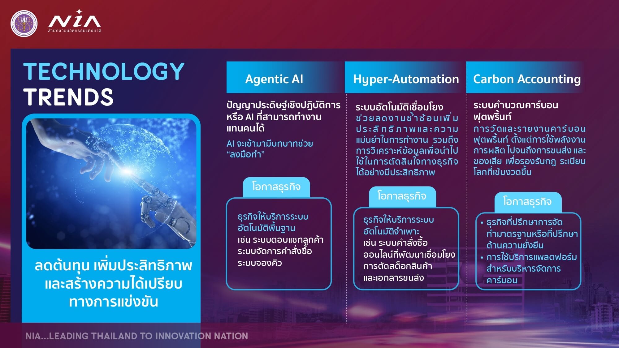 1) เทรนด์ทางเทคโนโลยี ที่จะช่วยให้ ‘ต้นทุนถูกลง’ และ ‘สร้างความสามารถในแข่งขันในระยะยาว’ โดยมีเทคโนโลยีที่น่าสนใจ เช่น Agentic AI (ปัญญาประดิษฐ์เชิงปฏิบัติการ) หรือ AI ที่สามารถทำงานแทนคนได้อย่างการตอบแชทลูกค้าพร้อมปิดการขาย การจัดการคำสั่งซื้อ การจองคิว การเปรียบเทียบราคา และการสั่งซื้อสินค้าโดยอัตโนมัติ Hyper-Automation (ระบบอัตโนมัติเชื่อมโยง) ระบบบอทที่ช่วยลดงานซ้ำๆ เพิ่มประสิทธิภาพ และความแม่นยำ รวมถึงการวิเคราะห์ข้อมูลที่ช่วยในการตัดสินใจทางธุรกิจได้อย่างมีประสิทธิภาพ เช่น เมื่อมีคำสั่งซื้อจากร้านค้า ข้อมูลจะวิ่งไปตัดสต็อกในระบบบัญชี และออกใบแปะหน้าขนส่งทันทีโดยไม่ต้องใช้คนคีย์ข้อมูลซ้ำ Carbon Accounting (ระบบคำนวณคาร์บอนฟุตพริ้นท์) ถือเป็นสิ่งจำเป็นสำหรับธุรกิจเอสเอ็มอีที่มีการส่งออกหรือเป็นซัพพลายเออร์ให้กับบริษัทใหญ่ โดยต้องจัดทำตั้งแต่การใช้พลังงาน การผลิต การขนส่ง และของเสีย เพื่อให้ทราบถึงร่องรอยการปลดปล่อยคาร์บอน เนื่องจากความเข้มงวดของกฎระเบียบโลก เช่น CBAM ของยุโรป ตลอดจน พ.ร.บ. โลกร้อน ที่อยู่ระหว่างการเตรียมการ