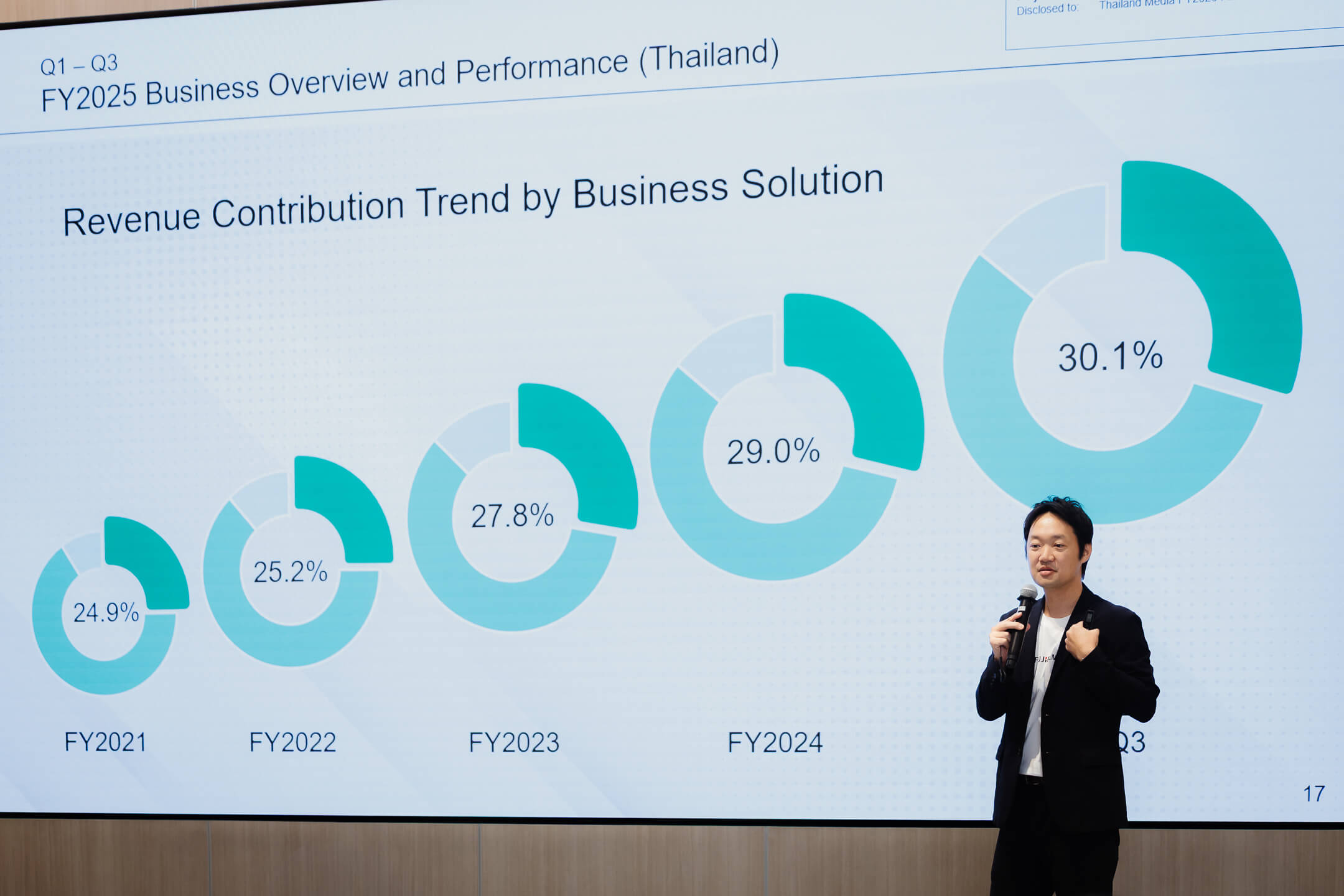 ในส่วนของผลประกอบการปี 2568 ฟูจิฟิล์ม บิสซิเนส อินโนเวชั่น (ประเทศไทย) ภายใต้การดำเนินงานของ 3 ธุรกิจหลัก ยังคงรักษาระดับผลประกอบการได้อย่างทรงตัว โดยบริษัทฯ ขับเคลื่อนองค์กรผ่าน 3 กลยุทธ์สำคัญ ได้แก่ Select & Focus, Market Coverage Optimization และ New Image Creation เพื่อสร้างความแตกต่างและเสริมความแข็งแกร่งในการแข่งขัน ส่งผลให้สามารถรักษาระดับรายได้จากธุรกิจหลักทั้ง 3 แกนได้อย่างต่อเนื่องตั้งแต่ไตรมาส 1 ถึงไตรมาส 3 และสามารถเพิ่มสัดส่วนกำไรจากการดำเนินธุรกิจในไตรมาส 3 ได้ที่ระดับ 4% เมื่อเทียบกับปีก่อนหน้า