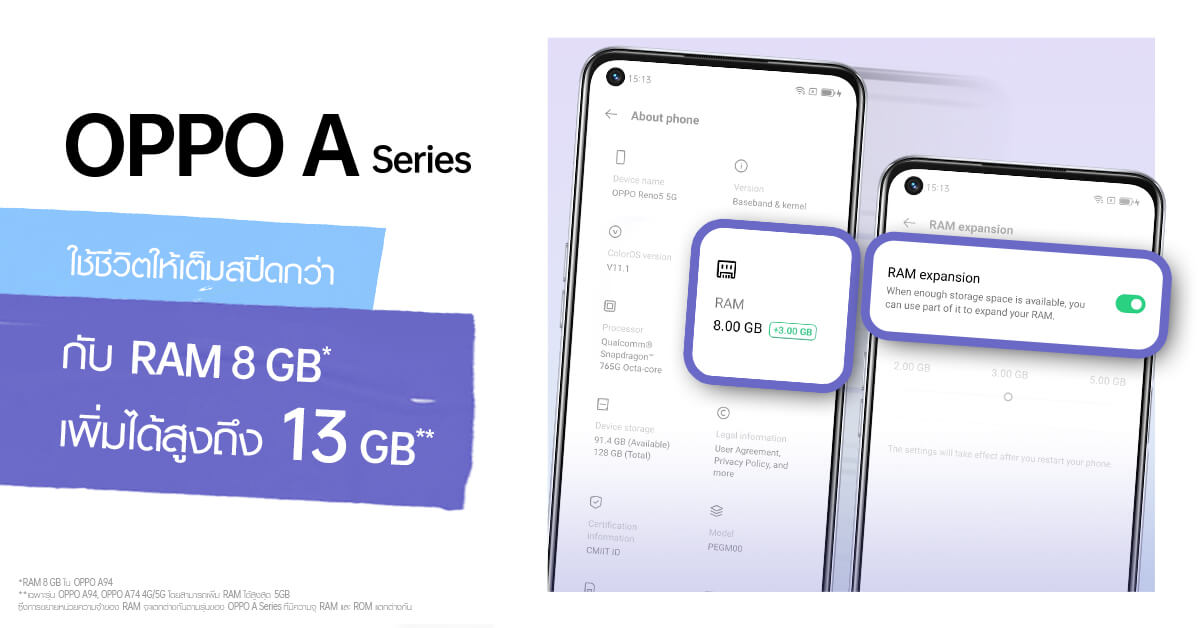 โดย RAM Expansion ของ OPPO จะช่วยให้ผู้ใช้สามารถปรับเปลี่ยน ROM ที่มีอยู่บนสมาร์ทโฟนเป็นหน่วยความจำเสมือน (RAM) ได้ พร้อมสามารถปรับเปลี่ยนระดับการขยายได้อิสระ ซึ่งผู้ใช้ OPPO A94, OPPO A74 5G และ OPPO A74 จะสามารถปรับระดับการขยายของ RAM ในระดับ 2GB, 3GB และ 5GB ได้บนสมาร์ทโฟนของตน