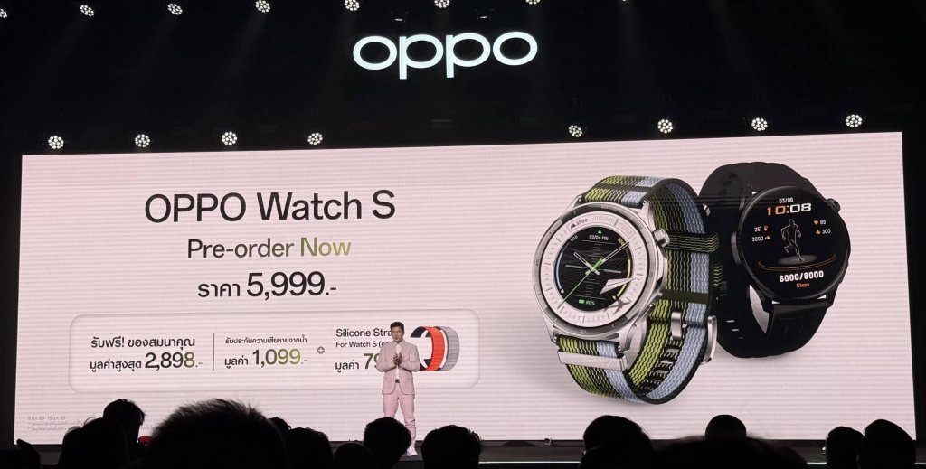 ออปโป้มอบนิยามใหม่แห่งความบางและความอัจฉริยะด้วยสมาร์ตวอตช์รุ่นล่าสุด OPPO Watch S มาพร้อมดีไซน์บางเฉียบที่สุดที่เคยมีมา ด้วยตัวเรือนที่บางเพียง 8.9 มม. และน้ำหนักเบาแค่ 35 กรัม เน้นความคล่องตัวและทันสมัย ให้ใส่สบายเหมือนไม่ได้ใส่ พร้อมเป็นโค้ชส่วนตัวบนข้อมือคุณ เพราะมีโหมดกีฬาแบบจัดเต็มมากกว่า 100 ประเภท ติดตามผลได้แบบเรียลไทม์ และโหมดโปรสำหรับ 12 กีฬายอดฮิตที่ให้ข้อมูลแม่นยำระดับมืออาชีพ ช่วยวางแผนการฝึกซ้อมที่เหมาะกับร่างกายคุณโดยเฉพาะ และยังมีฟีเจอร์ Heart Rate Broadcast ที่สามารถแชร์ข้อมูลหัวใจจากนาฬิกาไปแสดงผลบนเครื่องออกกำลังกายหรือไมล์จักรยานได้ทันที พร้อมยกระดับการดูแลสุขภาพด้วยเซนเซอร์อัจฉริยะระดับเรือธงที่ล้ำที่สุดในระดับราคาเดียวกัน ให้คุณติดตามข้อมูลร่างกายได้แม่นยำตลอด 24 ชั่วโมง เสริมด้วยนวัตกรรมอัลกอริทึมที่ OPPO คิดค้นขึ้นเอง เพื่อการดูแลสุขภาพทั้งทางกาย ใจ และการนอนหลับ รวมถึงฟิตเนสที่แม่นยำและน่าเชื่อถือยิ่งกว่าเดิม สามารถเชื่อมต่อได้ถึง 2 เครื่องพร้อมกัน เพื่อให้ไม่พลาดทุกการสื่อสาร ทั้งการรับสาย อ่านข้อความ และแจ้งเตือนการนัดหมายต่าง ๆ รองรับทั้งระบบปฏิบัติการ Android และ iOS พร้อมมอบประสิทธิภาพการใช้งานสุดลื่นไหลระดับเรือธง โดย OPPO Watch S มาใน 2 สีคลาสสิก แมชต์เข้าได้กับทุกชุด ได้แก่ สีเงิน Silver Gleam พร้อมสายในลอนถัก และสีดำ Phanthom Black พร้อมสายยางฟลูโอโรอีลาสโตเมอร์ วางจำหน่ายในราคา X,XXX บาท
