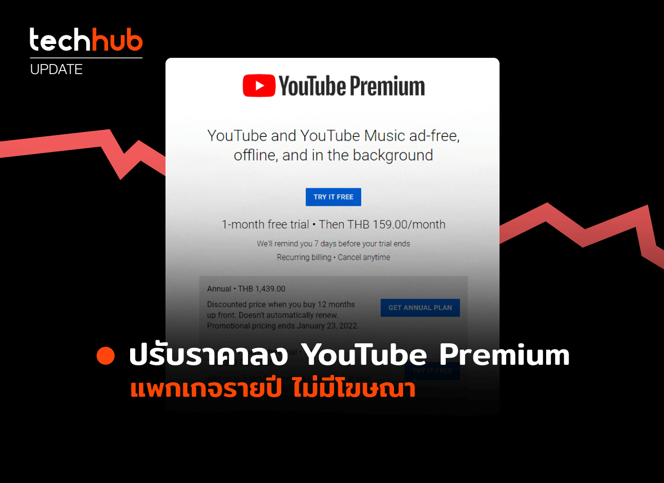 YouTube Premium เพิ่มแพ็กเกจรายปี (สำหรับ 1 คน) ในราคา 1,439 บาท หรือประมาณ 119.91 บาทต่อเดือน ซึ่งถูกกว่าแพ็กเกจรายเดือนที่ปัจจุบัน ราคาอยู่ที่เดือนละ 159 บาท หรือต้องปีละ 1,908 บาท