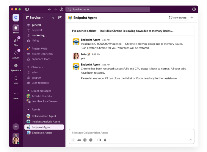 Agentforce IT Service พร้อมให้การสนับสนุนบุคลากรในทุกช่องทางการสื่อสารที่ใช้ ไม่ว่าจะเป็นใน Slack, Microsoft Teams, portal หรือ Webchat โดยเฉพาะอย่างยิ่งใน Slack ที่ทำให้การขอรับบริการ IT ง่ายขึ้นอย่างมาก บุคลากรสามารถส่งคำขอหรือสอบถามได้โดยตรงผ่านหน้าสนทนาที่คุ้นเคย ขณะที่ AI Agents จะจัดการงานต่าง ๆ โดยอัตโนมัติ เช่น การตอบคำถาม แก้ไขปัญหาเบื้องต้น หรือส่งต่อกรณีเร่งด่วนให้เจ้าหน้าที่ IT ทันที ส่งผลให้บุคลากรได้รับการช่วยเหลือแบบเรียลไทม์โดยไม่ต้องสลับไปใช้แอปพลิเคชันอื่น