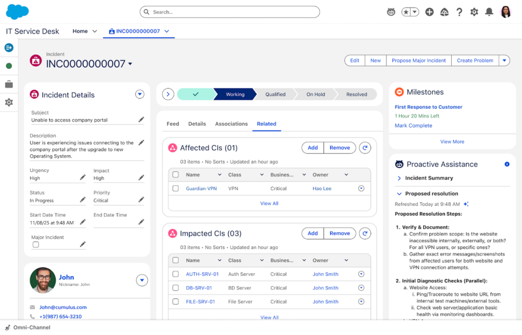 - การจัดการสถานการณ์แบบอัตโนมัติ (Automated Incident Management): Agentforce สามารถสร้างและจัดลำดับความสำคัญของเหตุการณ์โดยอัตโนมัติจากรายงานของบุคลากร หากมีบุคลากรหลายคนรายงานปัญหา VPN ระบบจะตรวจจับว่าปัญหานี้เป็นปัญหาที่เกิดขึ้นในวงกว้าง และทำการยกระดับเป็นสถานการณ์เร่งด่วนทันที