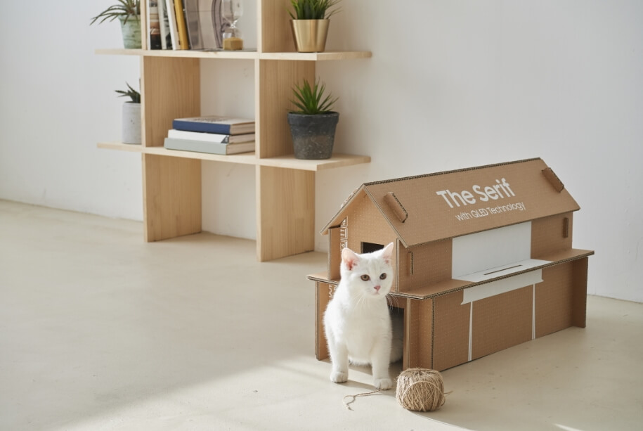 Eco-Packaging บรรจุภัณฑ์เพื่อความยั่งยืนของซัมซุง ที่สามารถนำมาประกอบใหม่เป็นของใช้ภายในบ้านที่น่ารักและสามารถใช้งานได้จริง ไม่ว่าจะเป็นชั้นวางของข้างเตียง โต๊ะกาแฟหรือแม้แต่บ้านแมว