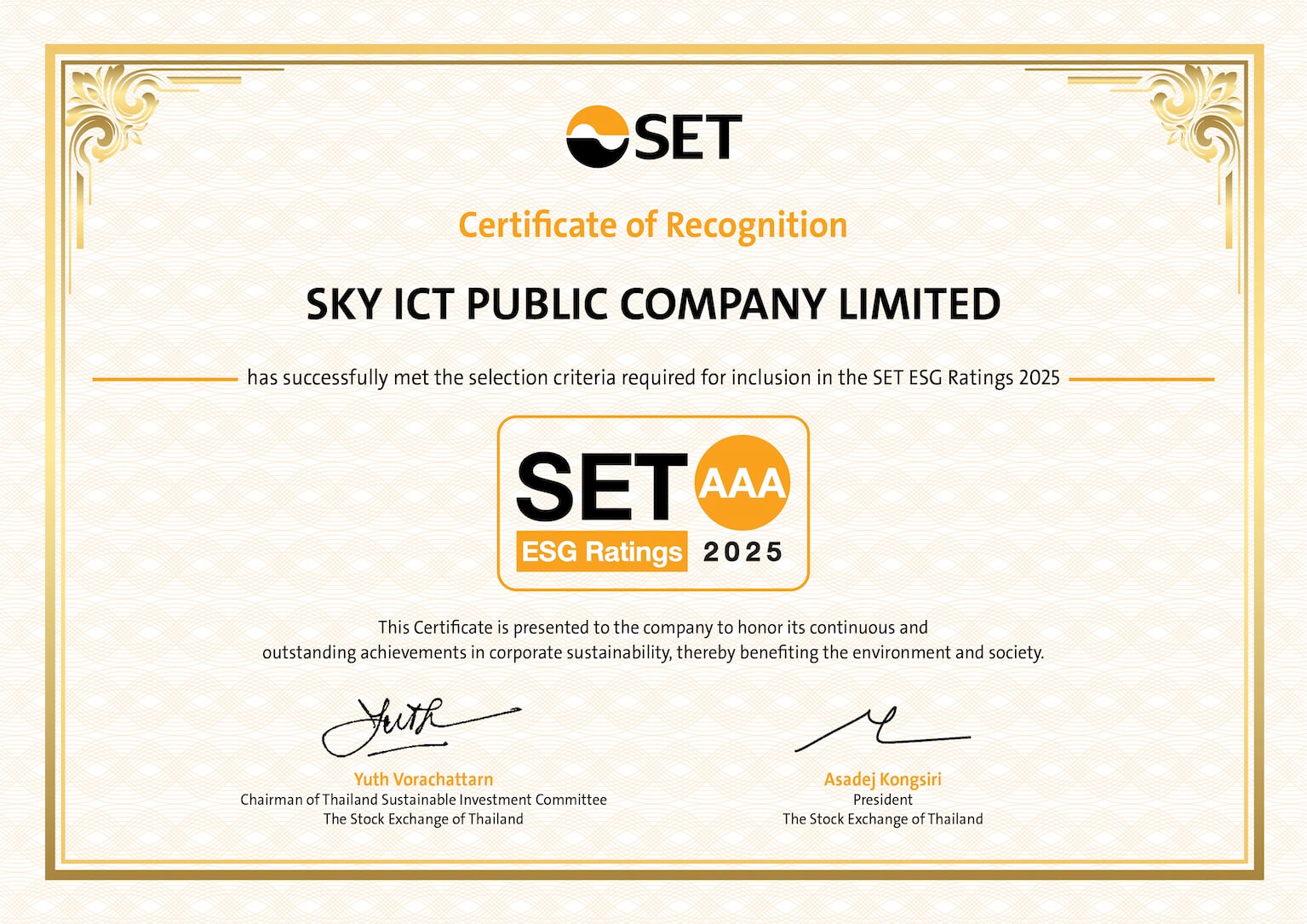 ทั้งนี้ SKY ICT ได้รับการจัดอันดับในระดับ “AAA” จาก SET ESG Ratings โดยคะแนน ESG ของ SKY ICT ทะยานระดับ Top-tier ตลาดทุนไทย สะท้อนความแข็งแกร่งเชิงโครงสร้าง ผลการประเมิน SET ESG Ratings 2025 แสดงให้เห็นอย่างชัดเจนว่า SKY ICT ไม่ได้เป็นเพียงบริษัทจดทะเบียนที่ “ผ่านเกณฑ์ ESG” แต่เป็นหนึ่งในองค์กรที่มี คุณภาพเชิงโครงสร้างเหนือกว่าค่าเฉลี่ยของตลาดอย่างมีนัยสำคัญ โดยบริษัททำ Total Score ได้สูงถึง 92 คะแนน สะท้อนให้เห็นว่า ผลลัพธ์ด้าน ESG ของบริษัทเกิดจากคุณภาพการบริหารจัดการและการวางกลยุทธ์ระยะยาว ที่ฝังอยู่ในโครงสร้างองค์กร สะท้อนความเป็นเลิศในการดำเนินธุรกิจภายใต้กรอบ Environmental, Social และ Governance (ESG) อย่างเป็นระบบ โปร่งใส และยั่งยืน ถือเป็นสัญญาณเชิงบวกต่อกลุ่มนักลงทุน สถาบัน และกองทุน ESG ทั้งในและต่างประเทศ ที่มองหาบริษัทจดทะเบียนซึ่งมีศักยภาพในการสร้างผลตอบแทนควบคู่ความยั่งยืนในระยะยาว โดยเฉพาะในช่วงที่กระแสการลงทุนอย่างรับผิดชอบ (Responsible Investment) กลายเป็นมาตรฐานใหม่ของตลาดทุนโลก โดยบริษัทที่สามารถรักษาเรทติ้ง ESG ในระดับสูงสุดได้อย่างต่อเนื่อง จะมีความได้เปรียบเชิงโครงสร้าง ทั้งในด้านต้นทุนเงินทุน ความเชื่อมั่นของผู้ถือหุ้น และโอกาสทางธุรกิจในอนาคต