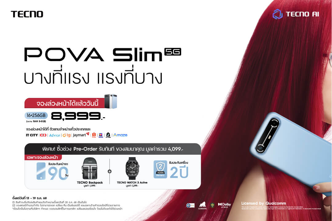 TECNO POVA SLIM จะเริ่มวางจำหน่ายอย่างเป็นทางการตั้งแต่วันที่ 20 ธันวาคม 2568 เป็นต้นไป ที่ร้าน IT CITY, TG Advice และ Jaymart ทุกสาขาทั่วประเทศ รวมถึงช่องทางออนไลน์ TikTok Shopee Lazada และ Amze